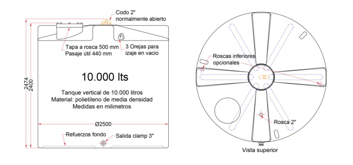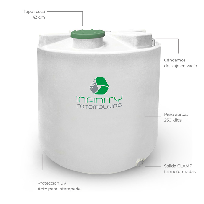 Fabricado en polietileno de media alta densidad, apto para agua, gas oil o casi cualquier producto químico.